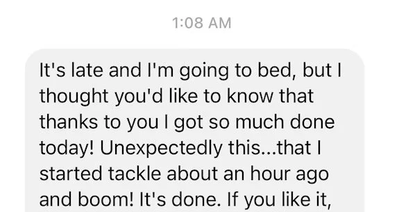 You helped me how to take my priorities, goals and dreams, organize them and then take small actionable steps. Now I've prioritized a good night of sleep. I was promoted at work. And more! There are actually 20+ accomplishments you've documented for me along the way!